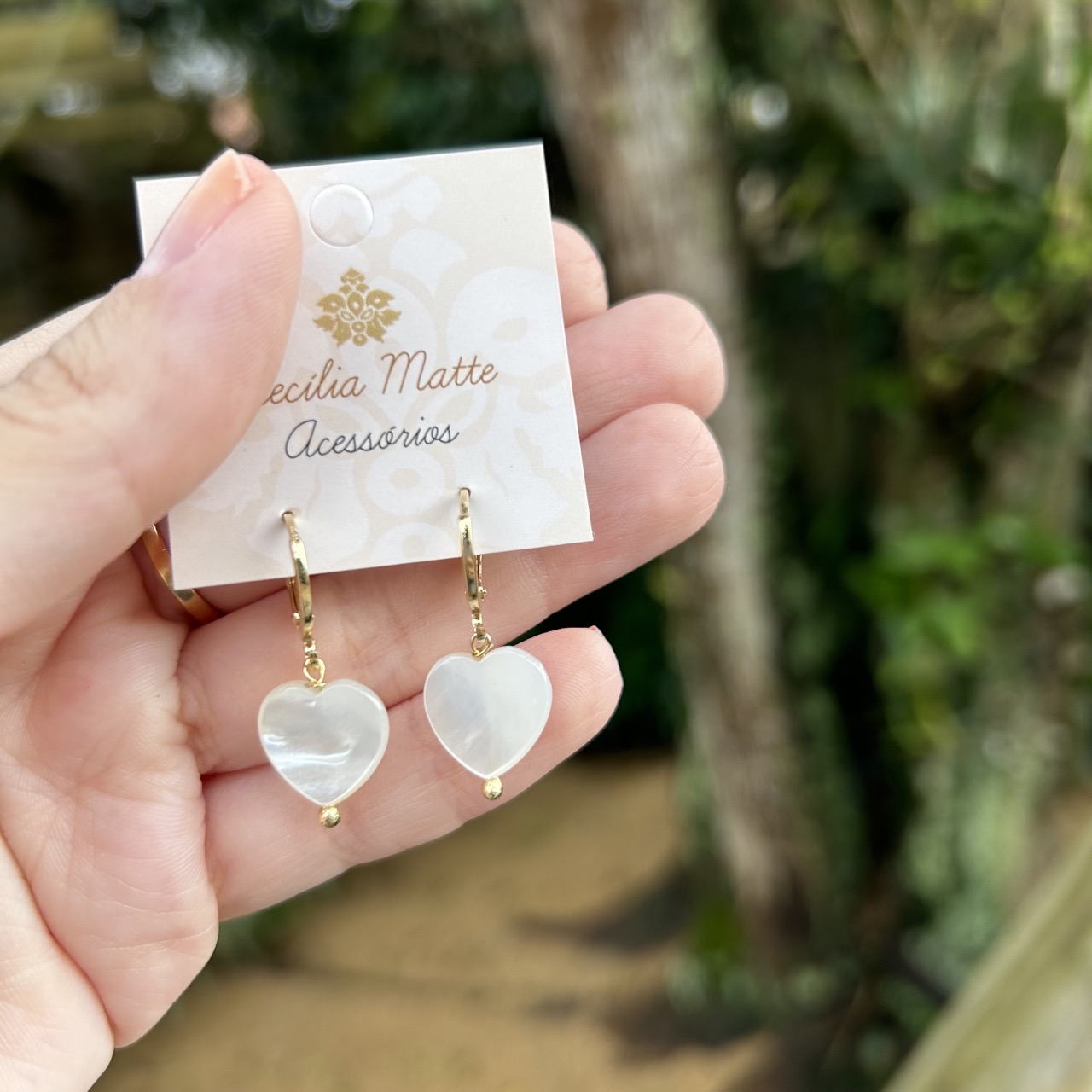 Brinco argolinha com coracao de madreperola aproximadamente 12mm