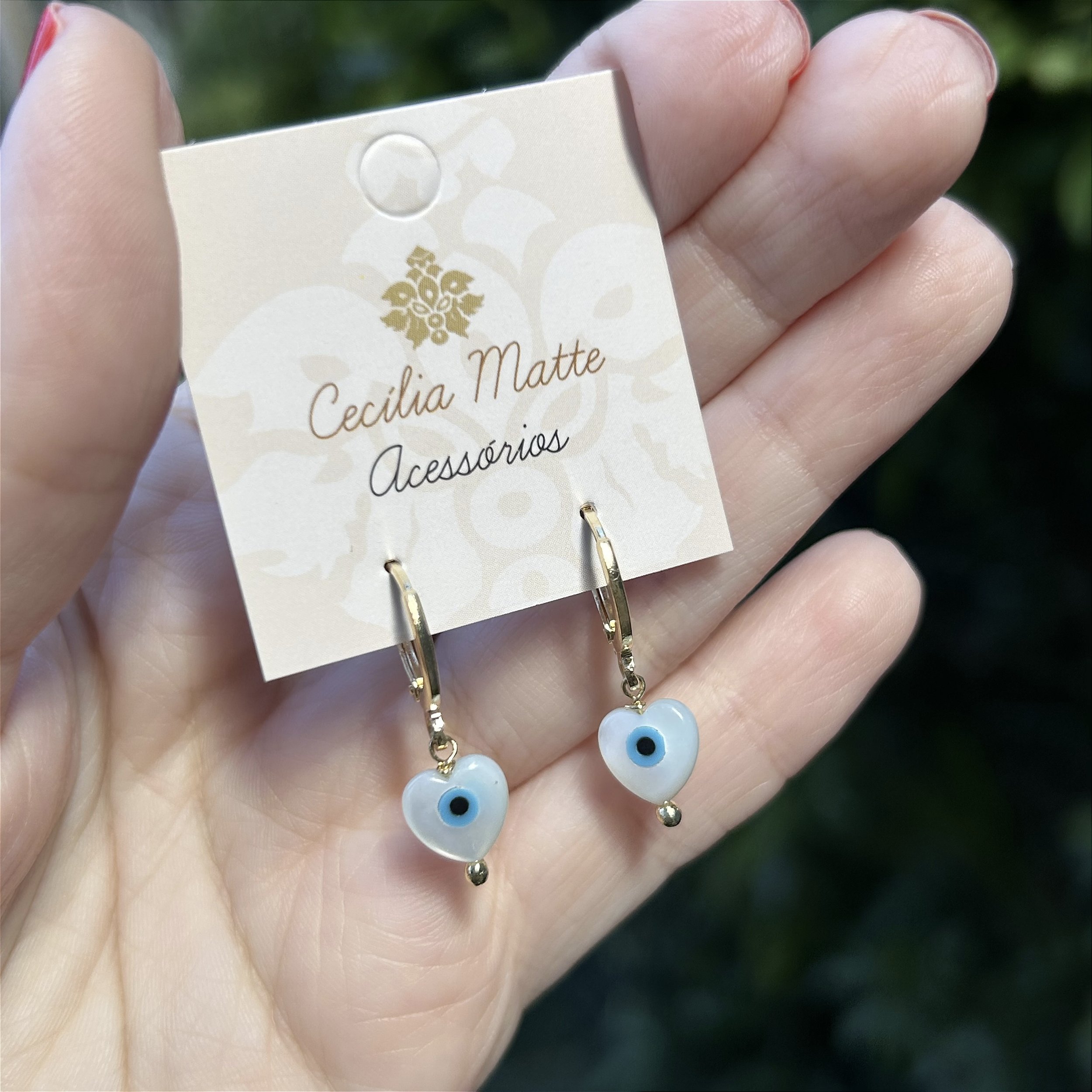 Brinco argolinha folheada a ouro com coração de madrepérola 8mm de olhinho grego