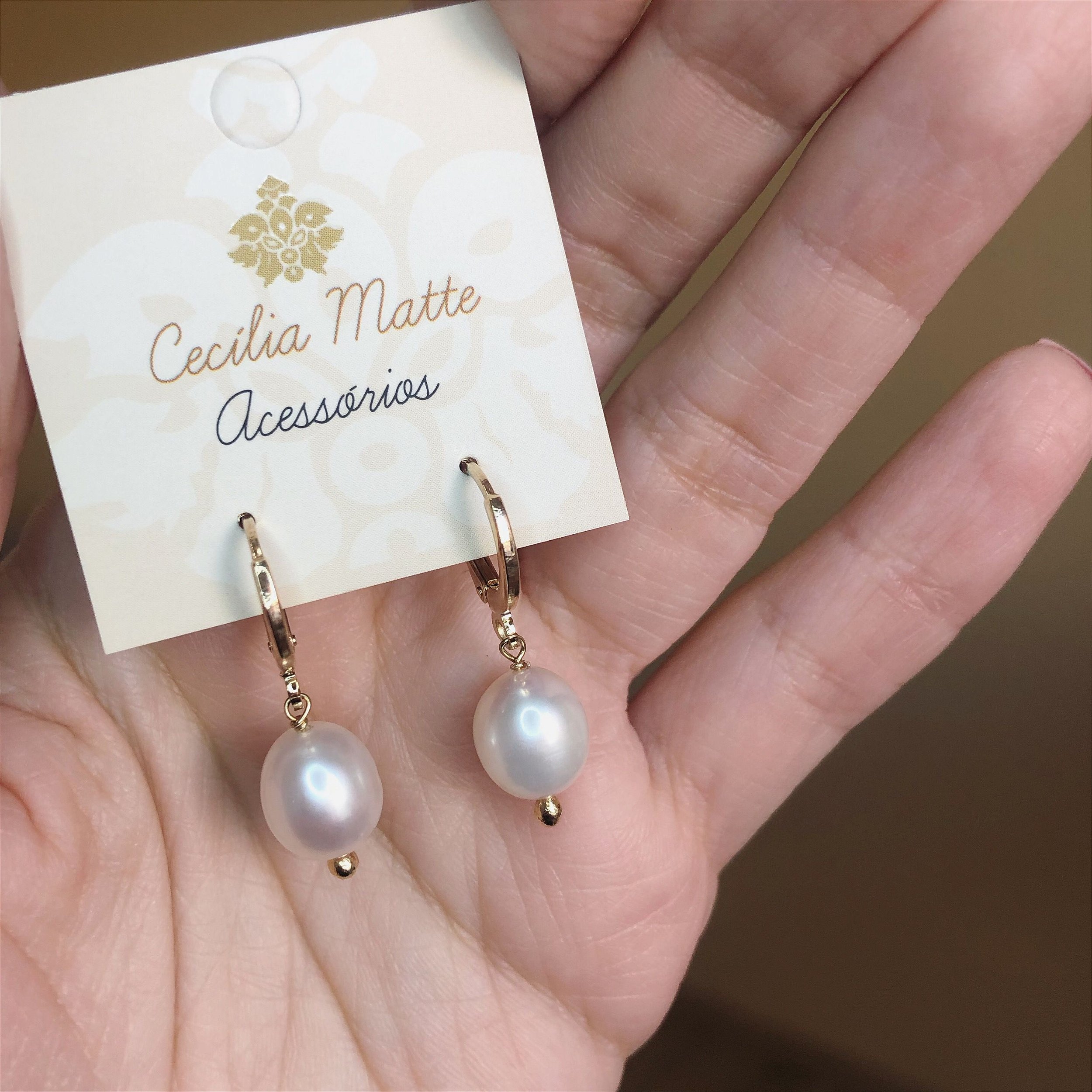 Brinco argolinha folheda a ouro 18kt com pérola natural do tipo arroz.