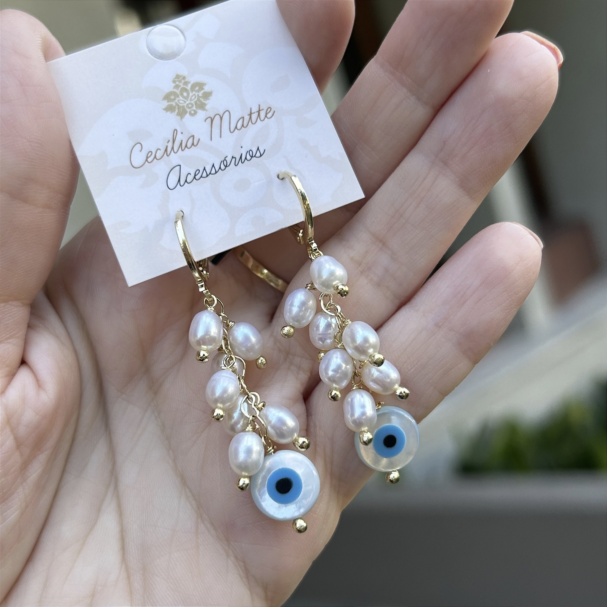 Colar folheado a ouro com base argolinha com pérolas arroz naturais e olho grego de madrepérola 10mm