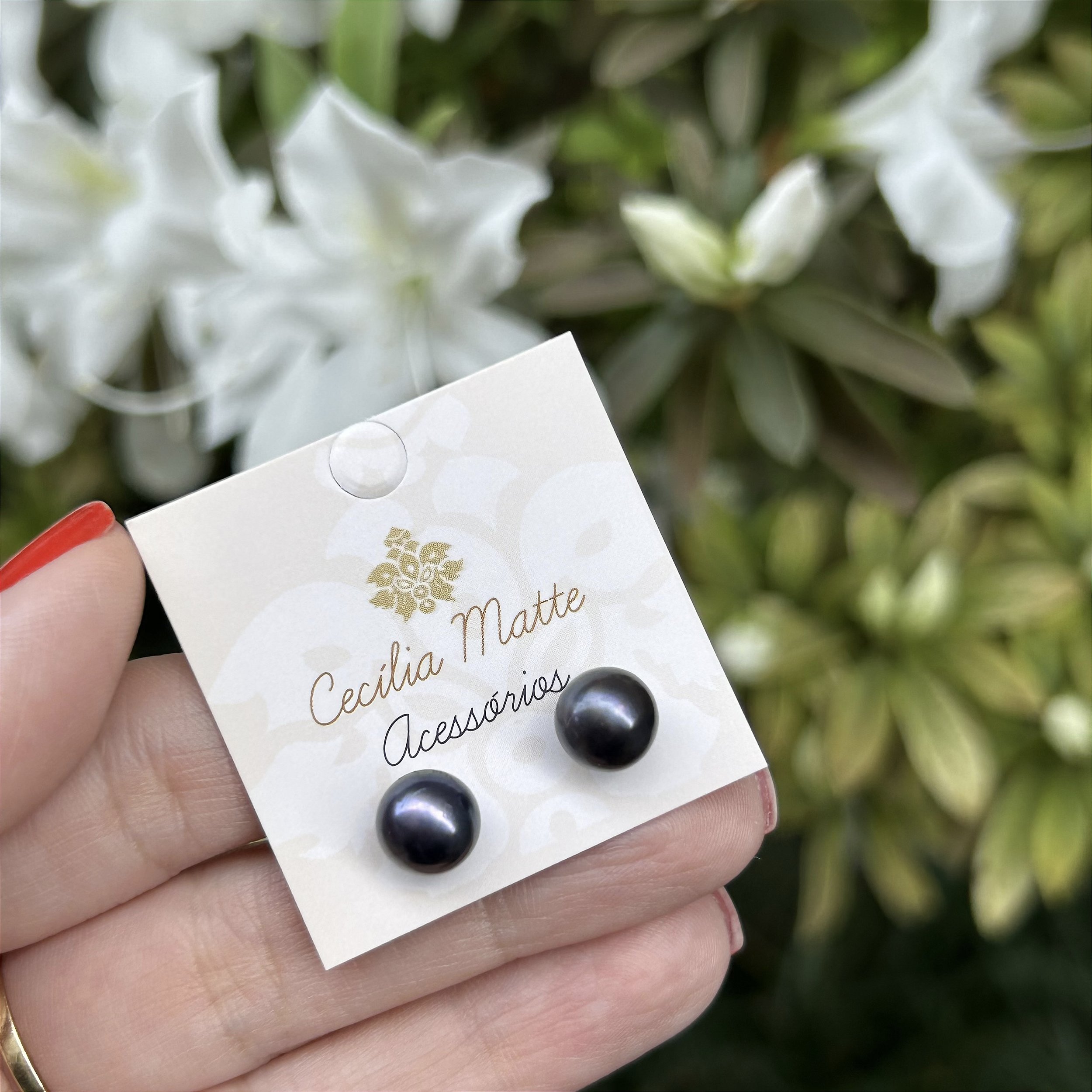 Brinco pérola negra natural 8mm com pino e tarracha folheados a ouro