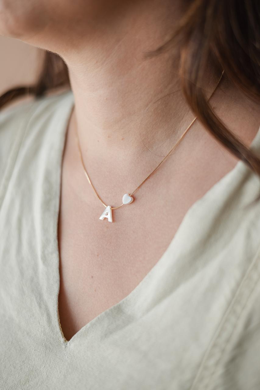 O colar de letrinha é uma excelente sugestão de presente! Ele pode simbolizar a letra da pessoa ou de alguém querido (filhos, marido, esposa...) e fica lindo para compor cascatinha com outros colares. O colar com 40 cm de comprimento e extensor de 4 cm. Em corrente veneziana folheada a ouro com espessura 0,6mm (fininha) com letrinha A em madreperola (madrepérola de letrinha fica solta na corrente para melhor caimento da peça) com aproximadamente 1 cm. Coracao de madrepérola fixo na corrente com aproximadamente 5mm.