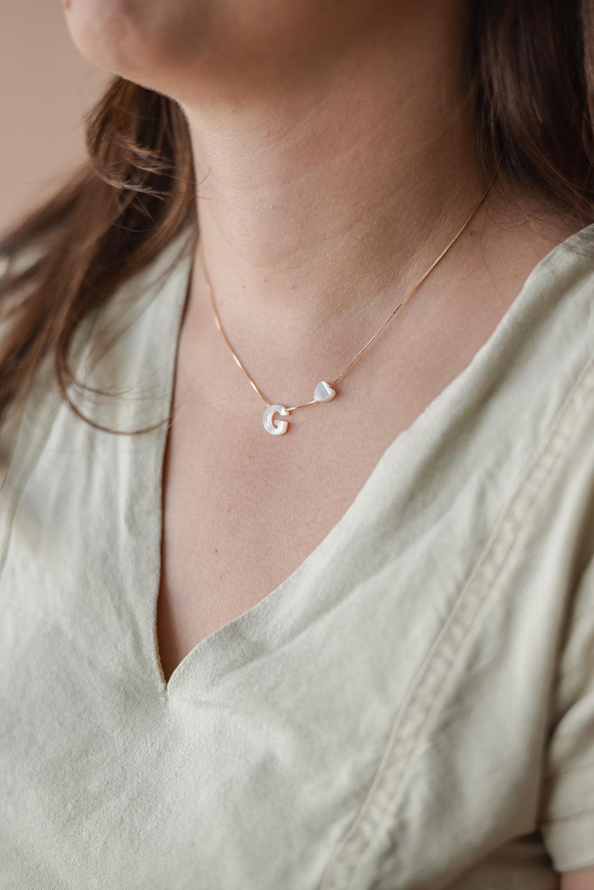 O colar de letrinha é uma excelente sugestão de presente! Ele pode simbolizar a letra da pessoa ou de alguém querido (filhos, marido, esposa...) e fica lindo para compor cascatinha com outros colares. O colar com 40 cm de comprimento e extensor de 4 cm. Em corrente veneziana folheada a ouro com espessura 0,6mm (fininha) com letrinha G em madreperola (madrepérola de letrinha fica solta na corrente para melhor caimento da peça) com aproximadamente 1 cm. Coracao de madrepérola fixo na corrente com aproximadamente 5mm.
