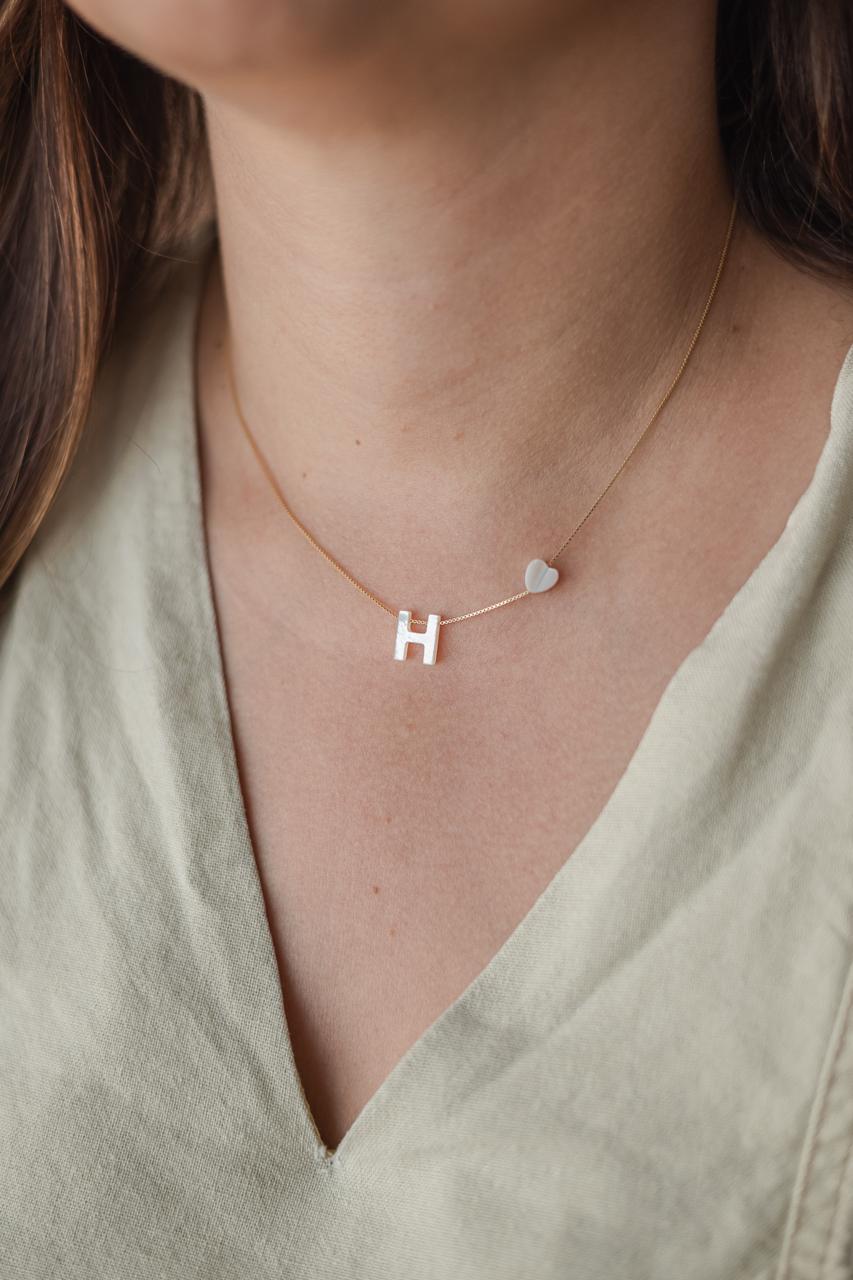 O colar de letrinha é uma excelente sugestão de presente! Ele pode simbolizar a letra da pessoa ou de alguém querido (filhos, marido, esposa...) e fica lindo para compor cascatinha com outros colares. O colar com 40 cm de comprimento e extensor de 4 cm. Em corrente veneziana folheada a ouro com espessura 0,6mm (fininha) com letrinha H em madreperola (madrepérola de letrinha fica solta na corrente para melhor caimento da peça) com aproximadamente 1 cm. Coracao de madrepérola fixo na corrente com aproximadamente 5mm.