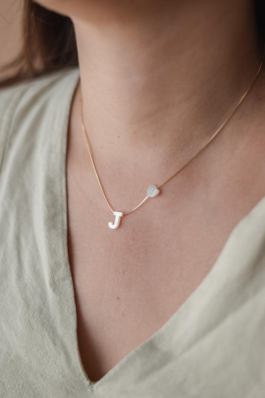 O colar de letrinha é uma excelente sugestão de presente! Ele pode simbolizar a letra da pessoa ou de alguém querido (filhos, marido, esposa...) e fica lindo para compor cascatinha com outros colares. O colar com 40 cm de comprimento e extensor de 4 cm. Em corrente veneziana folheada a ouro com espessura 0,6mm (fininha) com letrinha J em madreperola (madrepérola de letrinha fica solta na corrente para melhor caimento da peça) com aproximadamente 1 cm. Coracao de madrepérola fixo na corrente com aproximadamente 5mm.