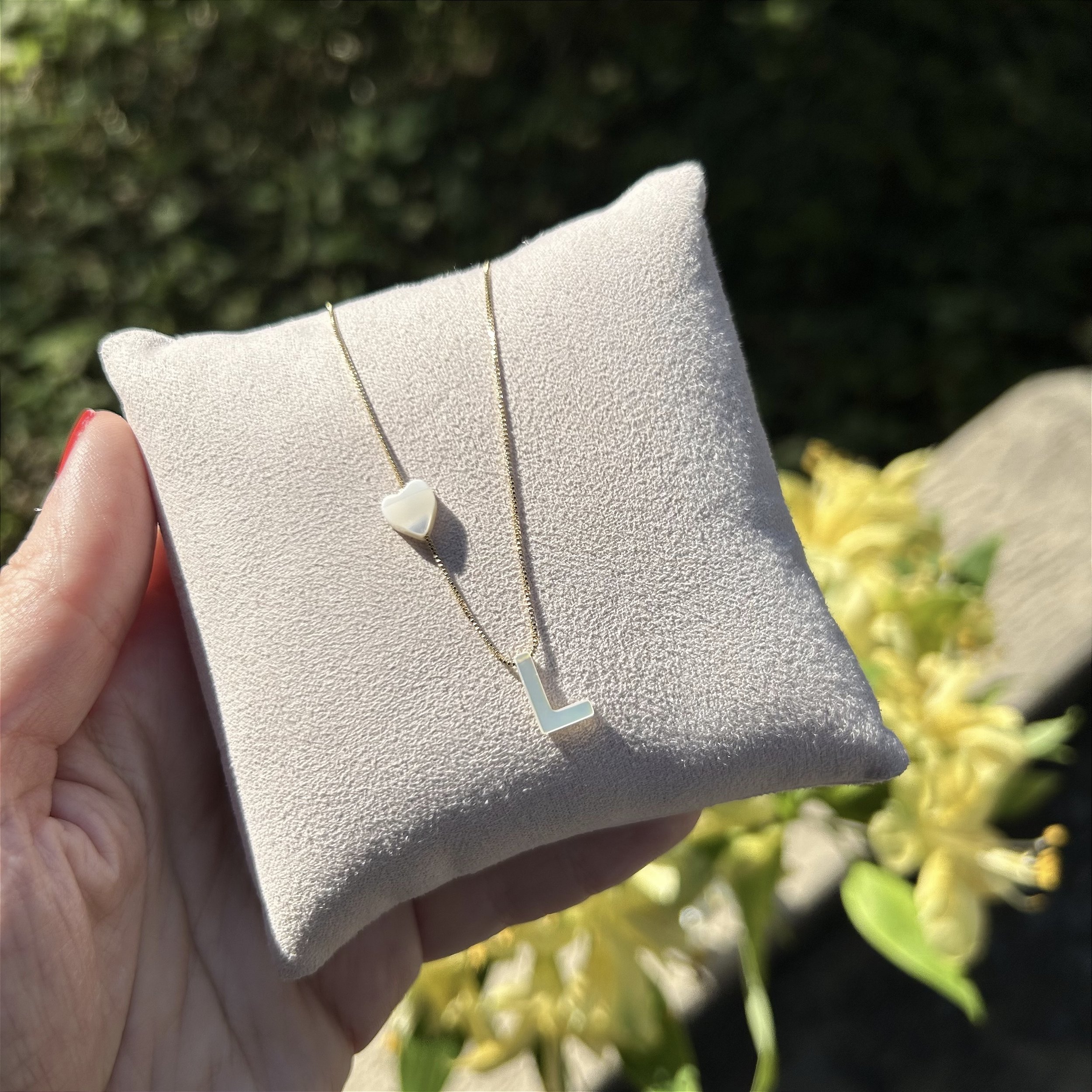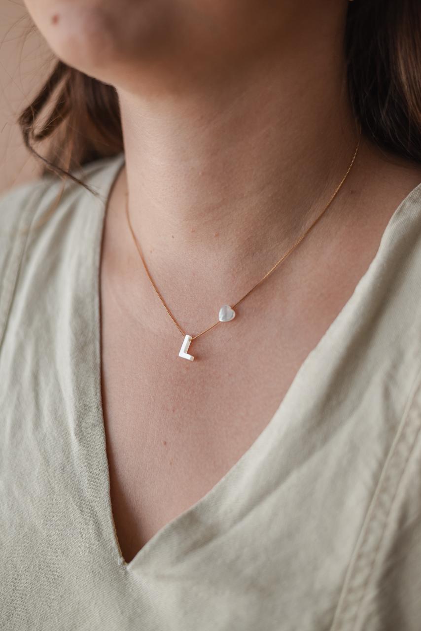 O colar de letrinha é uma excelente sugestão de presente! Ele pode simbolizar a letra da pessoa ou de alguém querido (filhos, marido, esposa...) e fica lindo para compor cascatinha com outros colares. O colar com 40 cm de comprimento e extensor de 4 cm. Em corrente veneziana folheada a ouro com espessura 0,6mm (fininha) com letrinha L em madreperola (madrepérola de letrinha fica solta na corrente para melhor caimento da peça) com aproximadamente 1 cm. Coracao de madrepérola fixo na corrente com aproximadamente 5mm.