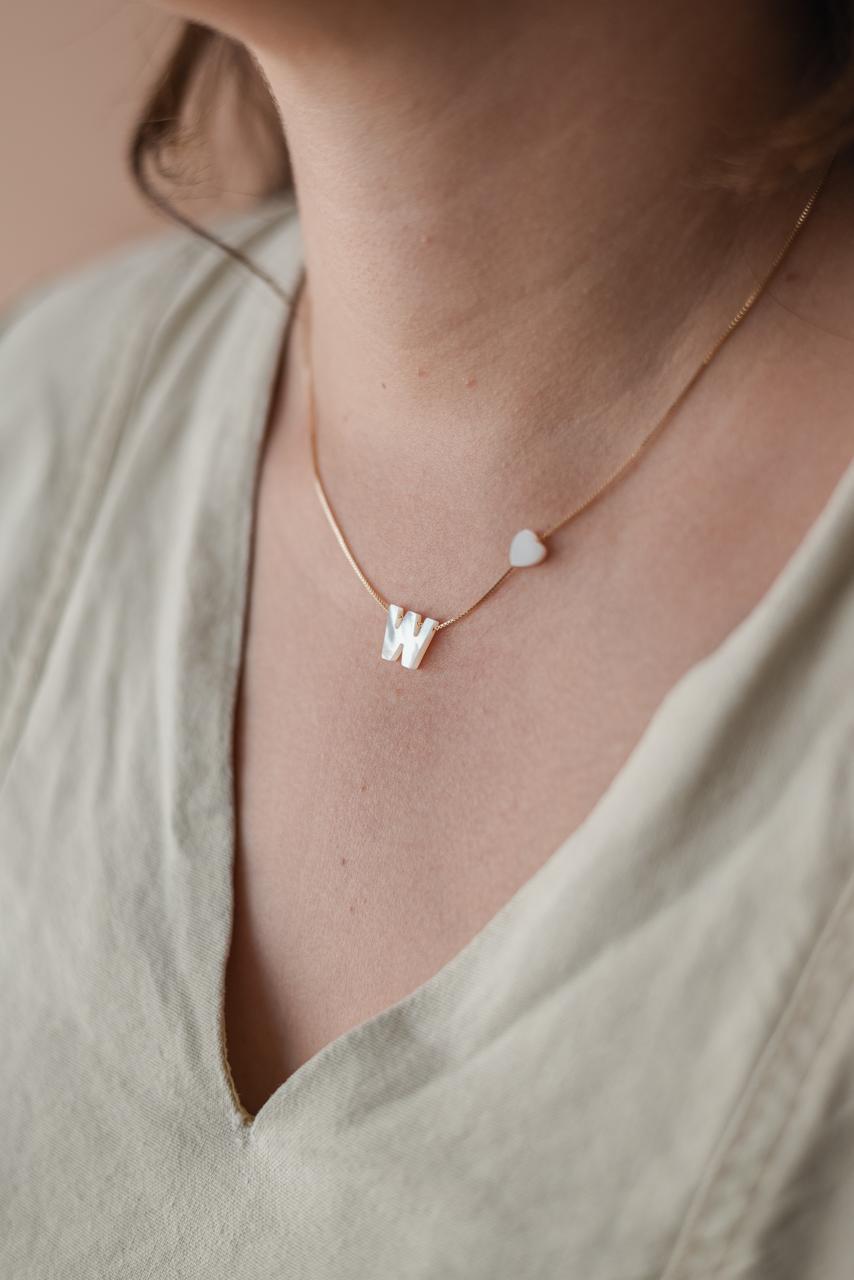 O colar de letrinha é uma excelente sugestão de presente! Ele pode simbolizar a letra da pessoa ou de alguém querido (filhos, marido, esposa...) e fica lindo para compor cascatinha com outros colares. O colar com 40 cm de comprimento e extensor de 4 cm. Em corrente veneziana folheada a ouro com espessura 0,6mm (fininha) com letrinha W em madreperola (madrepérola de letrinha fica solta na corrente para melhor caimento da peça) com aproximadamente 1 cm. Coracao de madrepérola fixo na corrente com aproximadamente 5mm.