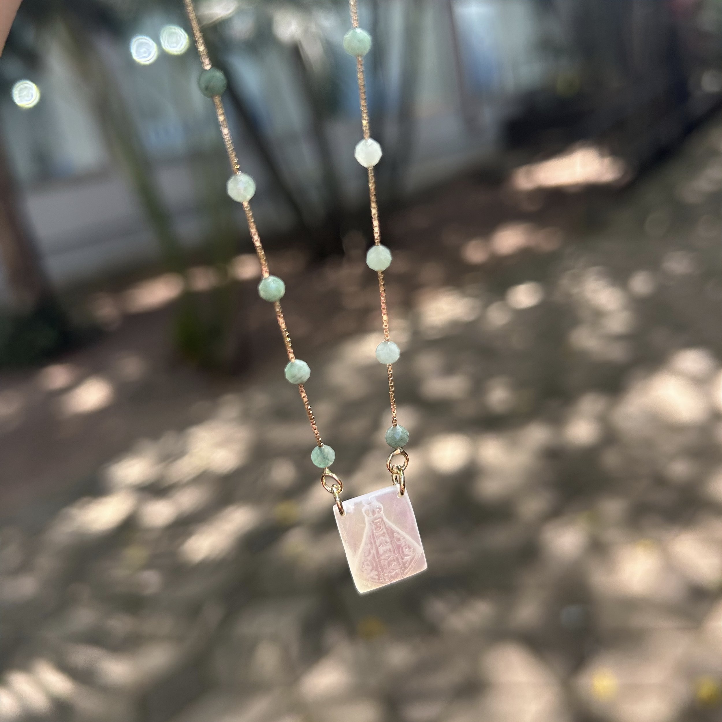 O pingente central em madrepérola com imagem de Nossa Senhora Aparecida — com acabamento luminoso e toque espiritual — completa a peça com um charme especial.