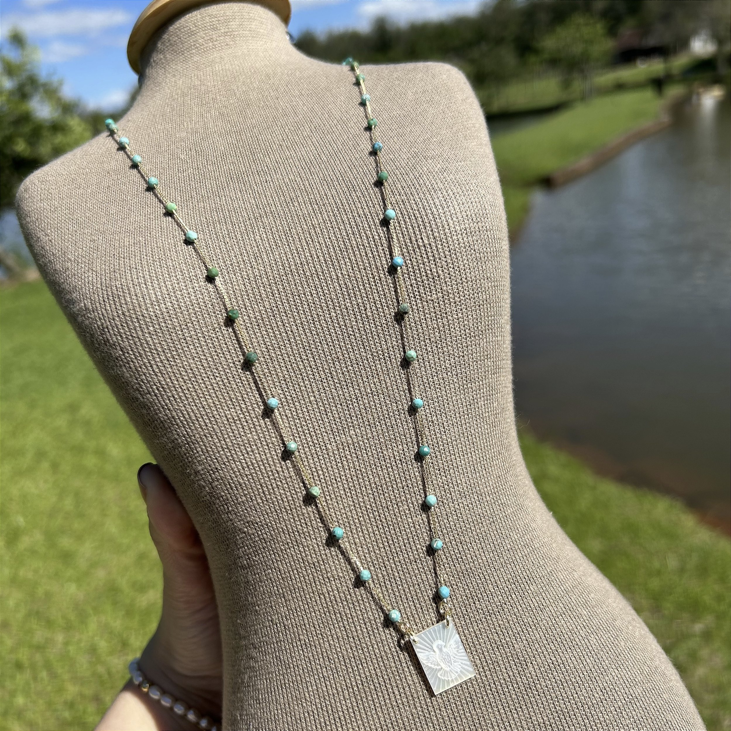Este colar longo de 65 cm é composto por turquesas naturais facetadas de 3 mm — pedras conhecidas por simbolizar proteção, força interior e equilíbrio. Seu tom azul vibrante cria um contraste delicado e moderno ao longo do fio finíssimo, trazendo frescor ao visual.