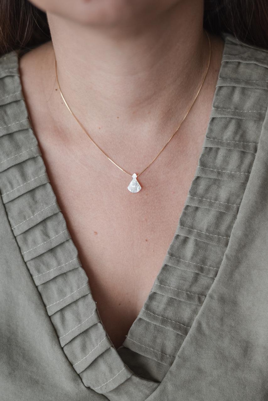 Colar folheado a ouro com 40 cm de comprimento com madrepérola esculpida imagem Nossa Senhora (1cm). Com extensor para ajuste do comprimento
