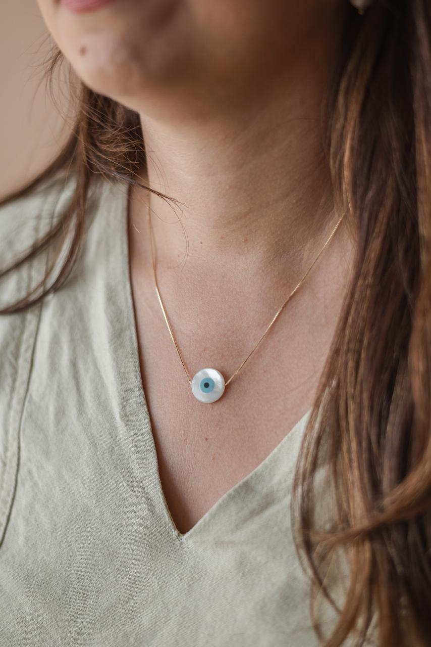 Colar folheado a ouro com corrente veneziana espessura 0,6mm com 45 cm de comprimento mais 5 cm de extensor para ajuste com olho grego de madreperola de 14mm