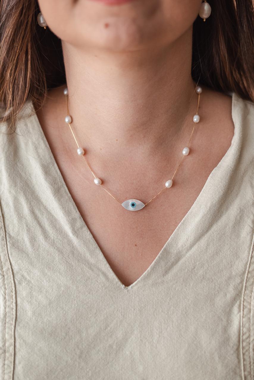 Colar folheado a ouro com pérolas naturais arroz (6mm) e olho grego de madrepérola oval (14mm). Com 45 cm de comprimento e extensor