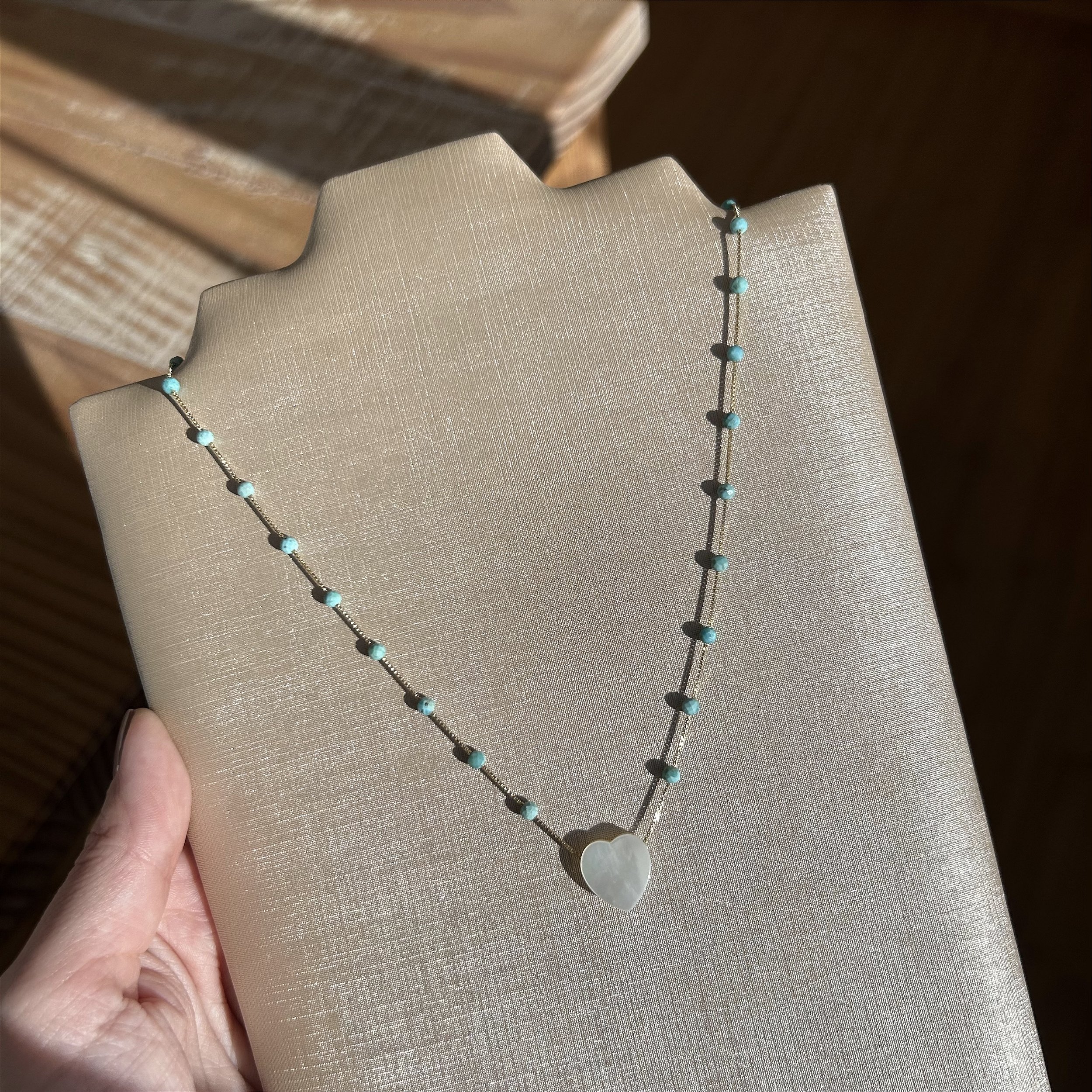 Colar 45 cm com turquesas naturais 3mm facetadas com coração de madrepérola de 12mm. Com extensor de 5 cm para ajuste