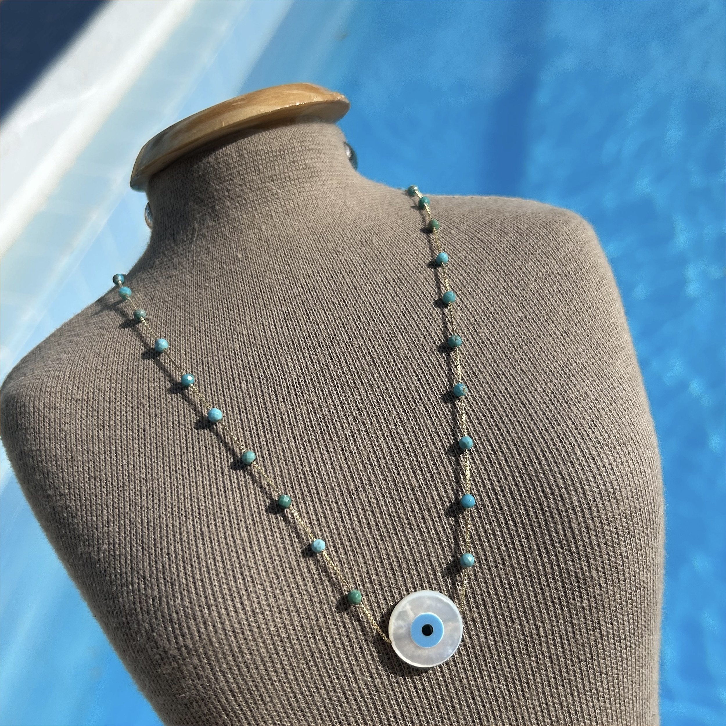 Colar folheado a ouro com Turquesas naturais faceadas (3mm) com olho grego de madrepérola natural (16mm). Com 45 cm de comprimento e extensor