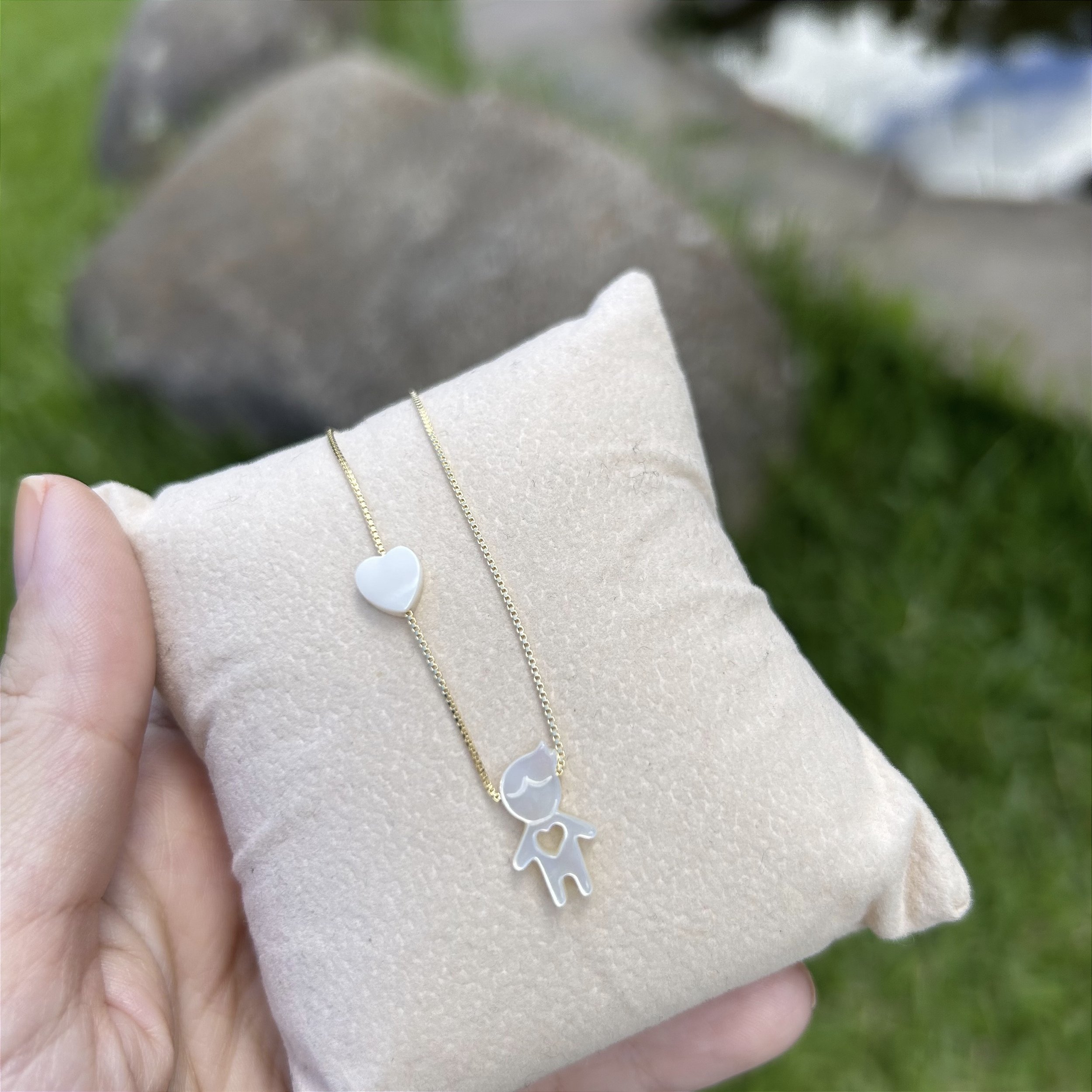 Nosso colar com pingente de menino em madrepérola é simplesmente encantador! O pingente super fofo traz um detalhe especial: um coraçãozinho vazado no peito, representando amor, proteção e conexão eterna. Uma joia perfeita para mães, dindas, avós ou para presentear alguém especial.