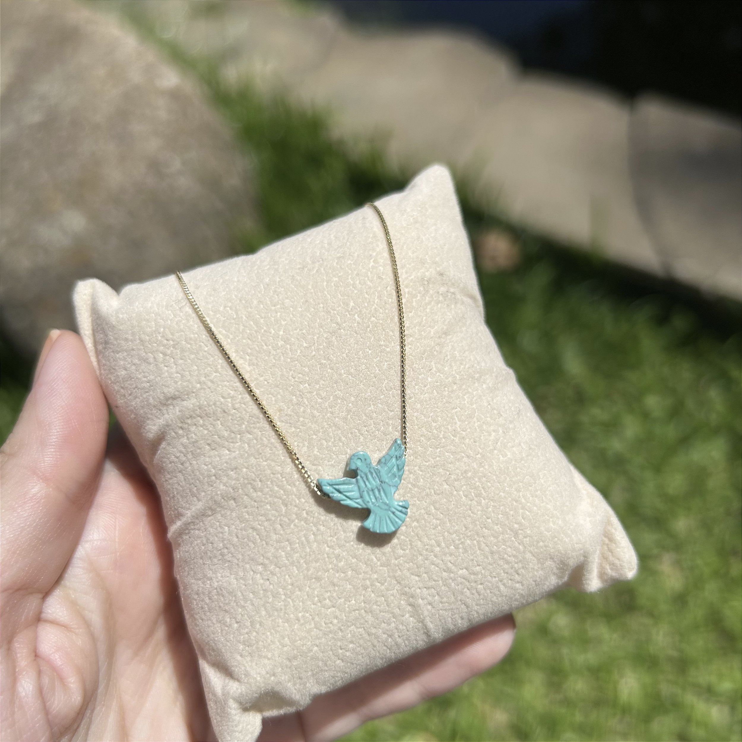 Colar folheado a ouro 40 cm com Espírito Santo em resina turquesa com 13mm. Com extensor para ajuste