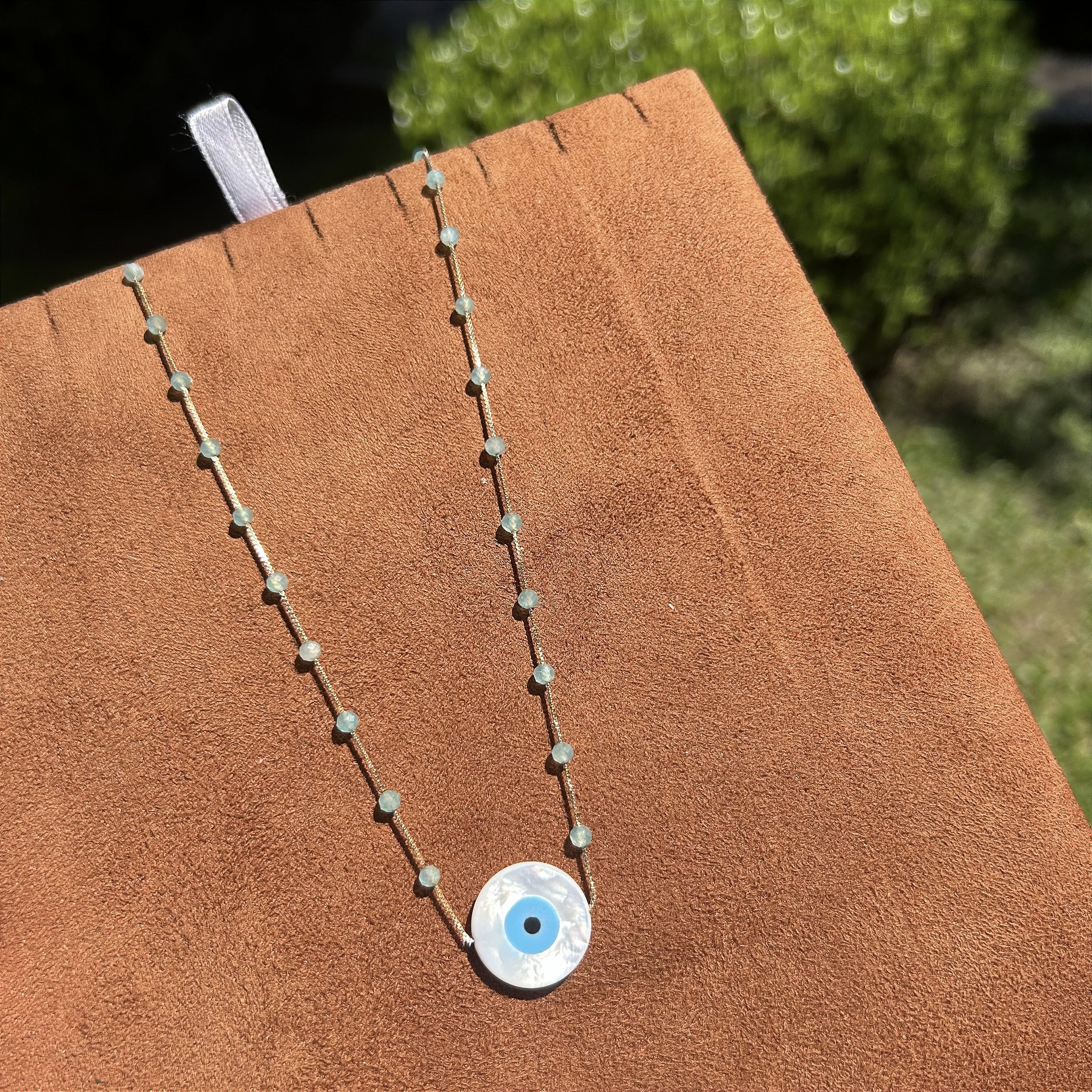 Uma joia que combina leveza e proteção. Este colar folheado a ouro traz corrente veneziana delicada, realçada por amazonitas facetadas de 3 mm — pedras conhecidas por suas cores suaves e energias tranquilizantes. O destaque fica por conta do pingente olho grego em madrepérola natural, com 16 mm, que simboliza sorte e proteção. A peça conta ainda com extensor, garantindo ajuste perfeito para diferentes estilos.