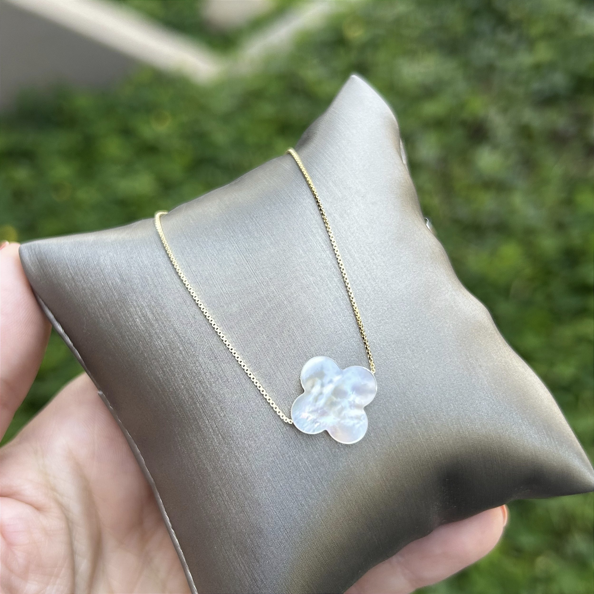 Colar folheado a ouro com trevo de madrepérola natural 14mm. Com extensor