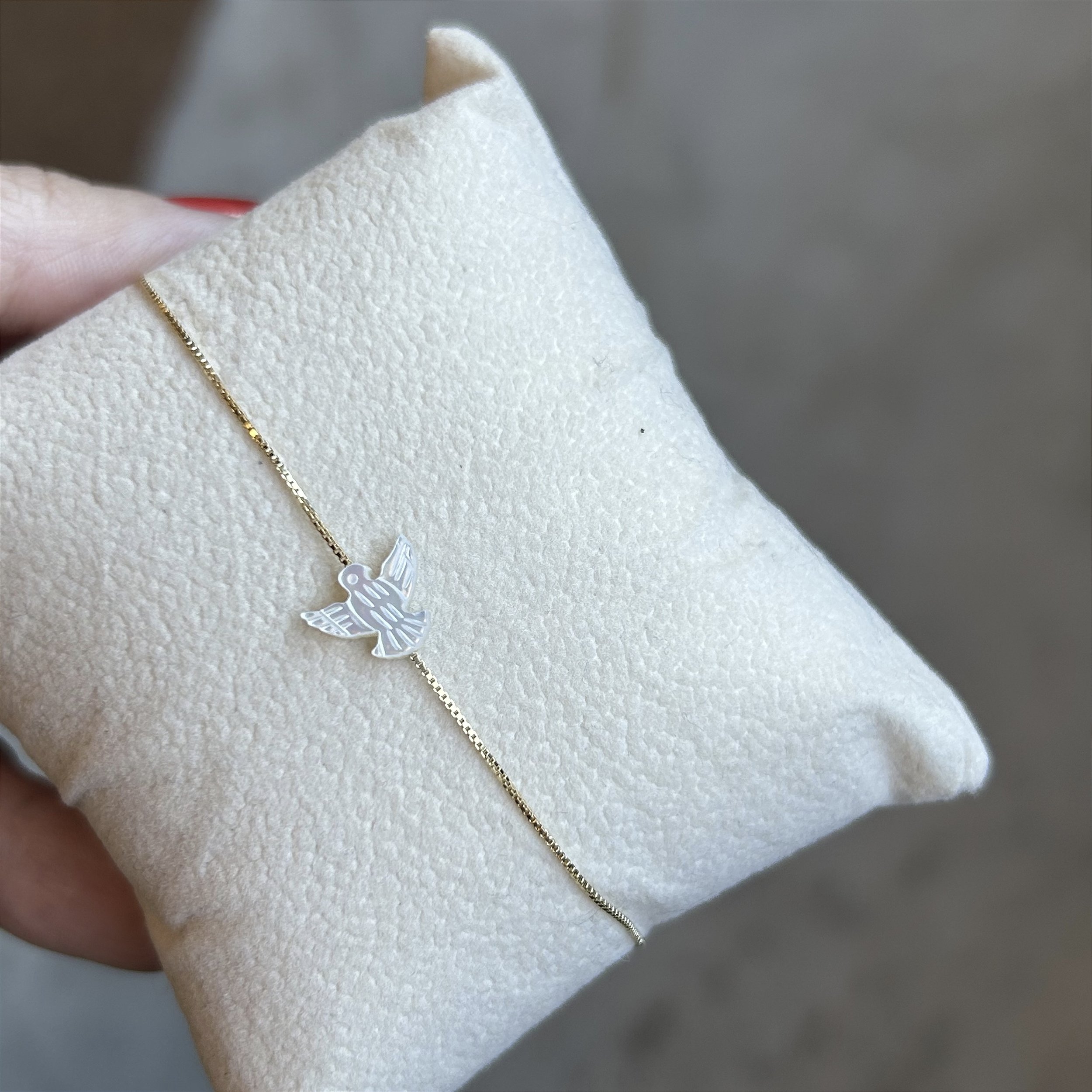 Pulseira folheada a ouro em corrente veneziana fininha (0,6mm) com espirito santo de madrepérola natural pequeno (1cm). Peça com 16,5 cm de comprimento mais extensor de 1,5 cm para ajuste