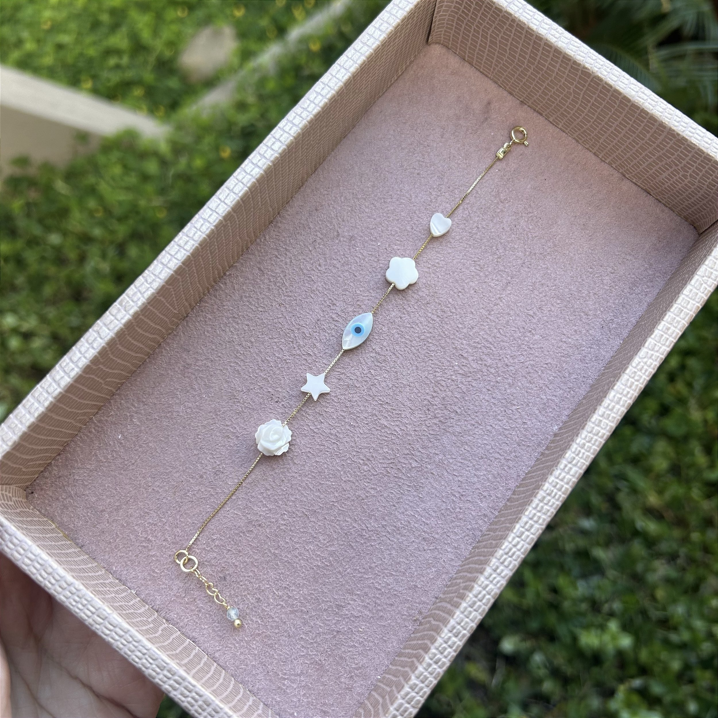 Pulseira Mix da Sorte Ano Novo 2026!! Com pingentes que representam todos nossos desejos para o novo ano: Olho grego para Proteção, flor margarida para Alegria, estrela para Sucesso, flor rosa Paixão e coração Amor. Com detalhe de pedra Água Marinha no extensor, que é a pedra do ano de 2026!! Para começar o ano de pé direito!!
