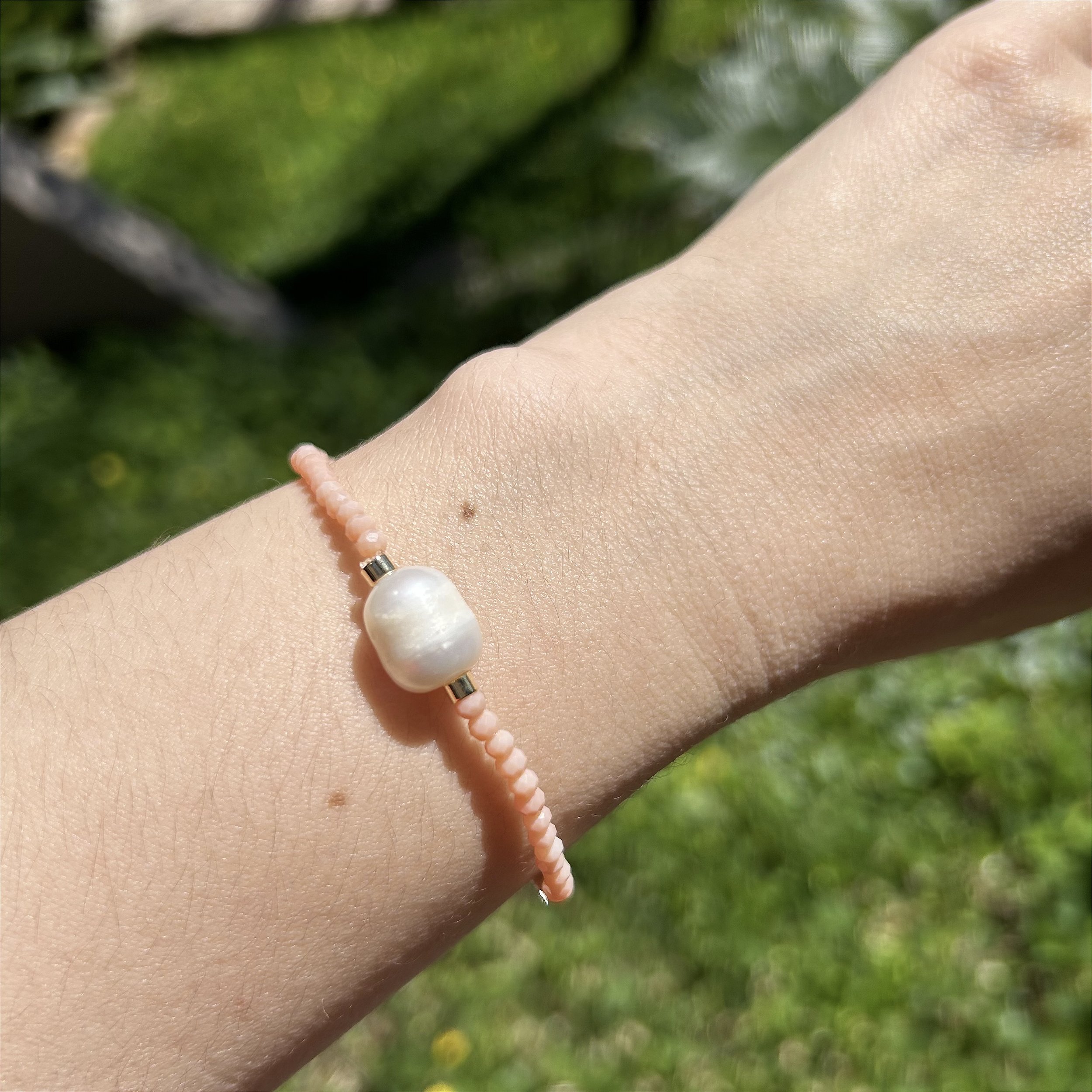 Pulseir em silicone (elástica) com cristals coral 3mm e pérola arroz natural