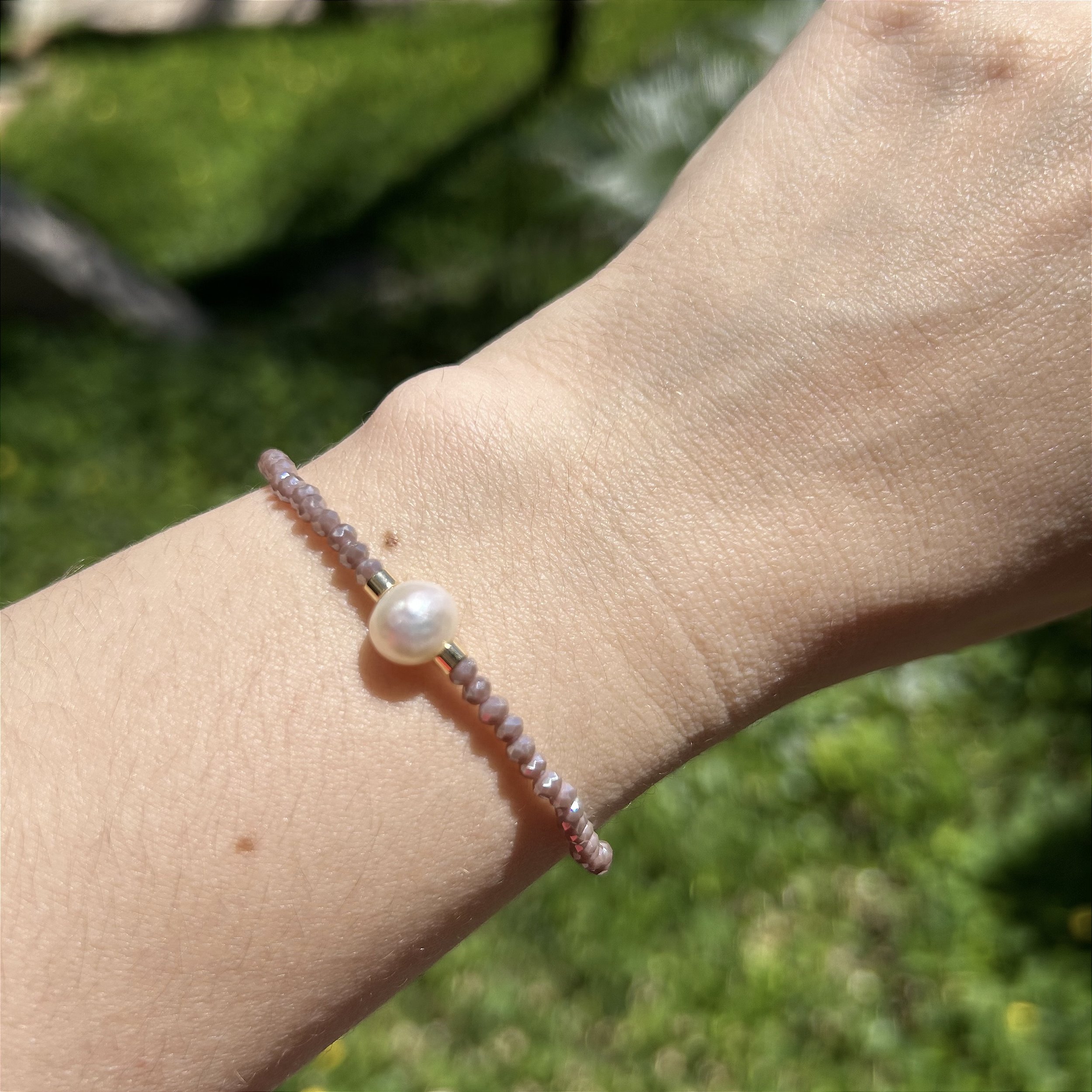 Pulseira em silicone (elástica) com cristais 3mm cor fumê e pérola batata